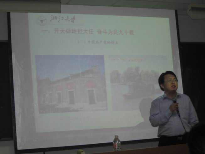 在第一部分,沈老师以“开天辟地担大任、奋斗为民九十载”为标题,介绍了中国共产党90年的发展历程。《社会主义核心价值体系读本》、《中国科学技术史》、《百年耻辱纪要》。。。。。。沈老师引经据典,力图比较客观的再现中国共产党创立前期的中国社会;从太平天国到洋务运动,从戊戌变法到辛亥革命,在对乱世中振兴中华的多种政治力量的比较中,凸显出中国共产党的独特优势;此外,沈老师还特别给同学们展示了一张“中国共产党历次党代会概况一览表”,通过分析、比较每次会议的主题,展现中国共产党与时俱进的优秀品质。当然,其间沈老师也直言不讳的指出文革时期许多大家难以想象的不正常现象,希望大家能够熟知历史,引以为戒。