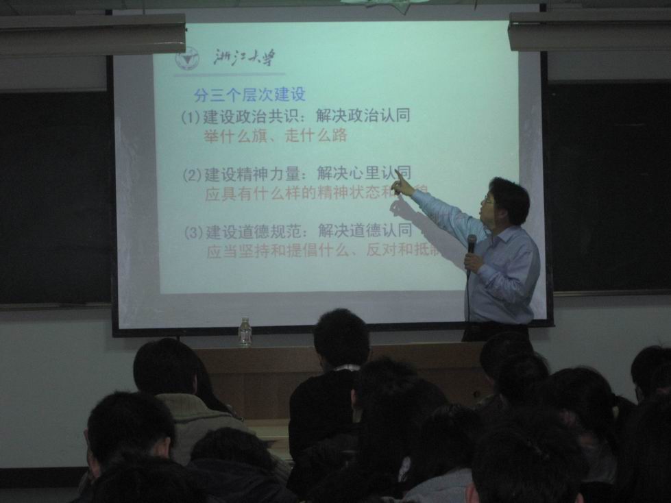 在第二部分——“问渠那得清如许、为有源头活水来”的章节中,沈老师论述了社会主义核心价值体系的基本内容以及建立与宣传这一价值体系的重要性。其间,沈老师提到了中国古代“三纲五常”在维持两千多年封建社会以及西方以个人主义为主要内容的价值体系在资本主义制度建设和发展中的基础作用,从而指出中国建立和宣传社会主义核心价值体系的重要性和必要性。同时,沈老师还介绍了当下美国比较成功的“国魂教育”理念以及新加坡的“共同价值白皮书”的宣传模式,开阔同学们的思路。