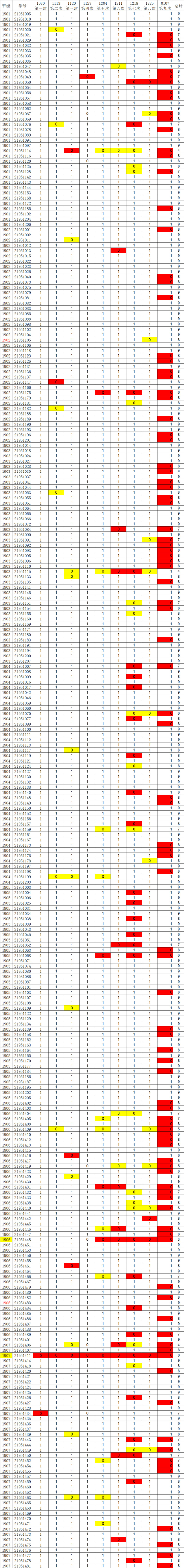 其中,出勤情况以签到“学号”为准,标红部分为未签到,标黄部分为签到时间明显偏离正常签到时间段。