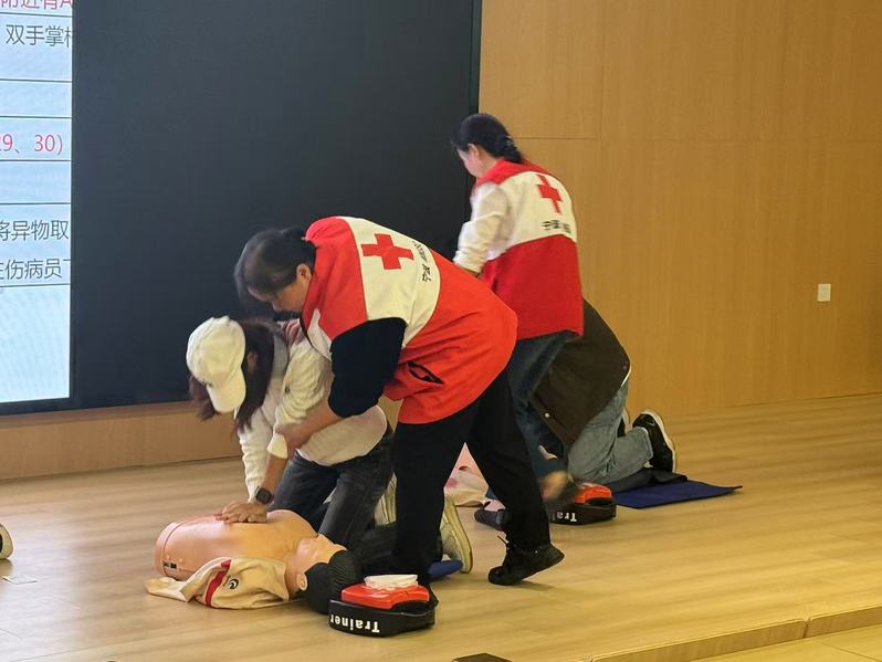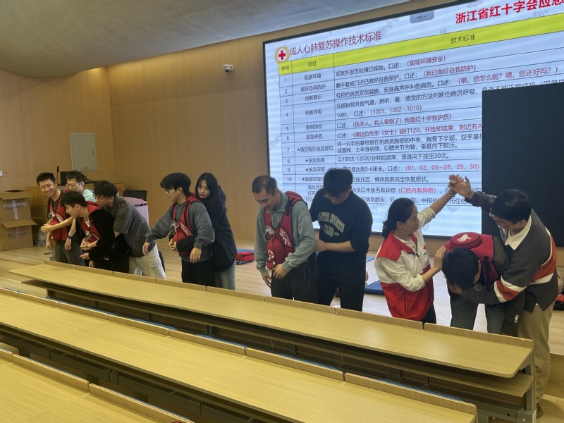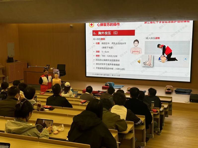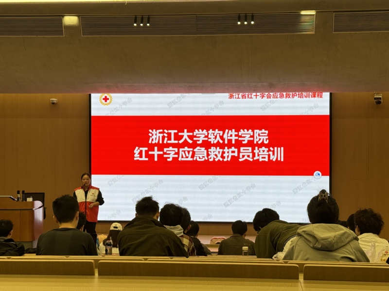 2025年11月1日,宁波市第2025029-30期救护员(初级)培训班在浙江大学软件学院开展,来自宁波市红十字会的戚丽娜老师对软件学院30名师生展开了培训。通过系统的理论学习、实操训练,在场师生深入学习了心肺复苏(CPR)、自动体外除颤仪(AED)使用、气道异物梗阻处置及基础创伤救护等急救技能。