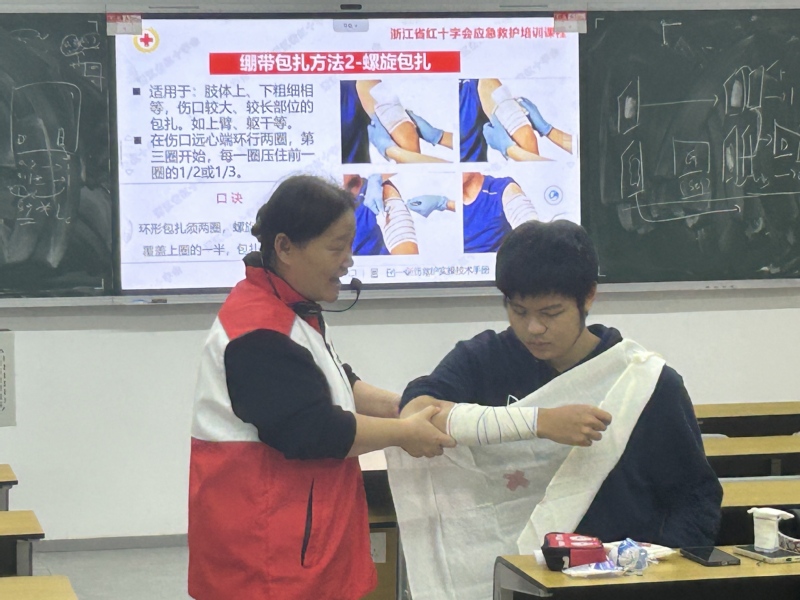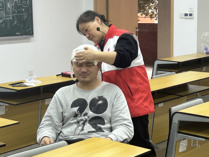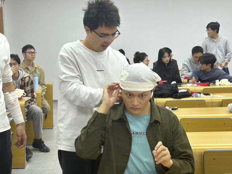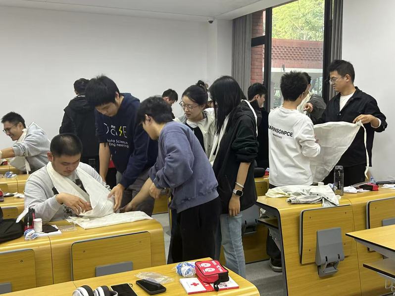 同时,课程还覆盖校园常见意外的创伤救护知识,从出血类型识别入手,通过现场示范与讲解帮助学员们掌握止血方法、固定技巧等创伤救护知识。最后老师还讲解了头部帽式包扎、肩部燕尾式包扎、手臂悬吊带包扎等实用技巧,明确“三角巾的顶角对准伤口方向”“打结避开伤口位置”等操作规范。这些贴近校园场景的细节讲解,为后续实操环节搭建了扎实的知识框架。整场理论课既有专业指南支撑,又兼顾实用性,学员们认真记录要点,不时就疑问与老师互动交流。