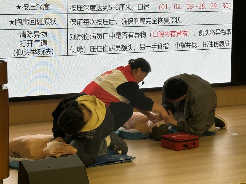 培训以理论授课拉开序幕,戚老师结合生活中的真实急救案例讲解了应急救护的基本原则与操作规范,迅速调动起学员们的学习积极性。培训内容按“生命支持优先级”科学排布,先聚焦心跳呼吸骤停这一危急场景,详解心肺复苏(CPR)与自动体外除颤仪(AED)使用核心知识。