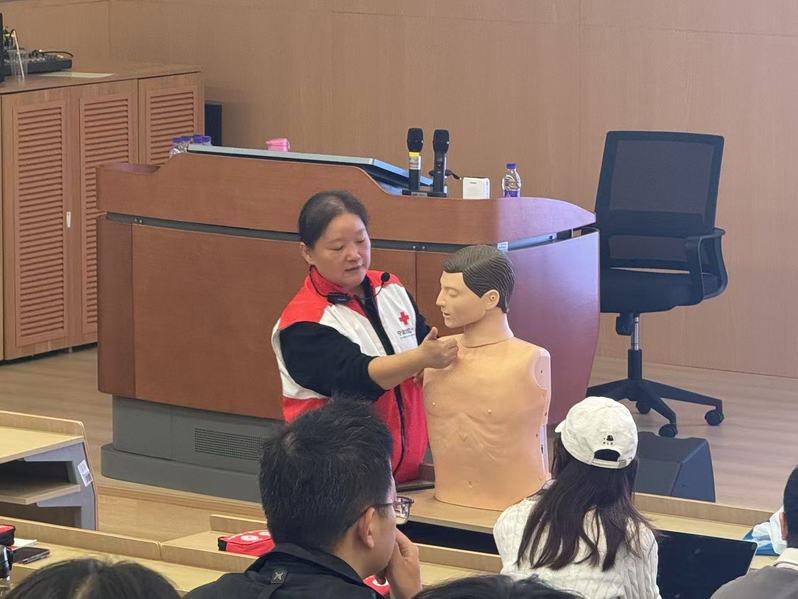 “判断呼吸时必须做到‘听、看、感觉’三要素,用面颊感受呼吸气流的同时观察胸腹部起伏,10秒内完成判断至关重要。” 戚老师逐步拆解胸外按压的深度、频率、姿势等关键参数,对AED从开机、贴放电极片到心律分析、电击实施的全流程进行讲解。随后,课程延伸至气道异物梗阻急救,老师通过现场示范,清晰展示拍背法与海姆立克急救法的动作要领,并着重强调“黄金4分钟”的急救窗口期价值。